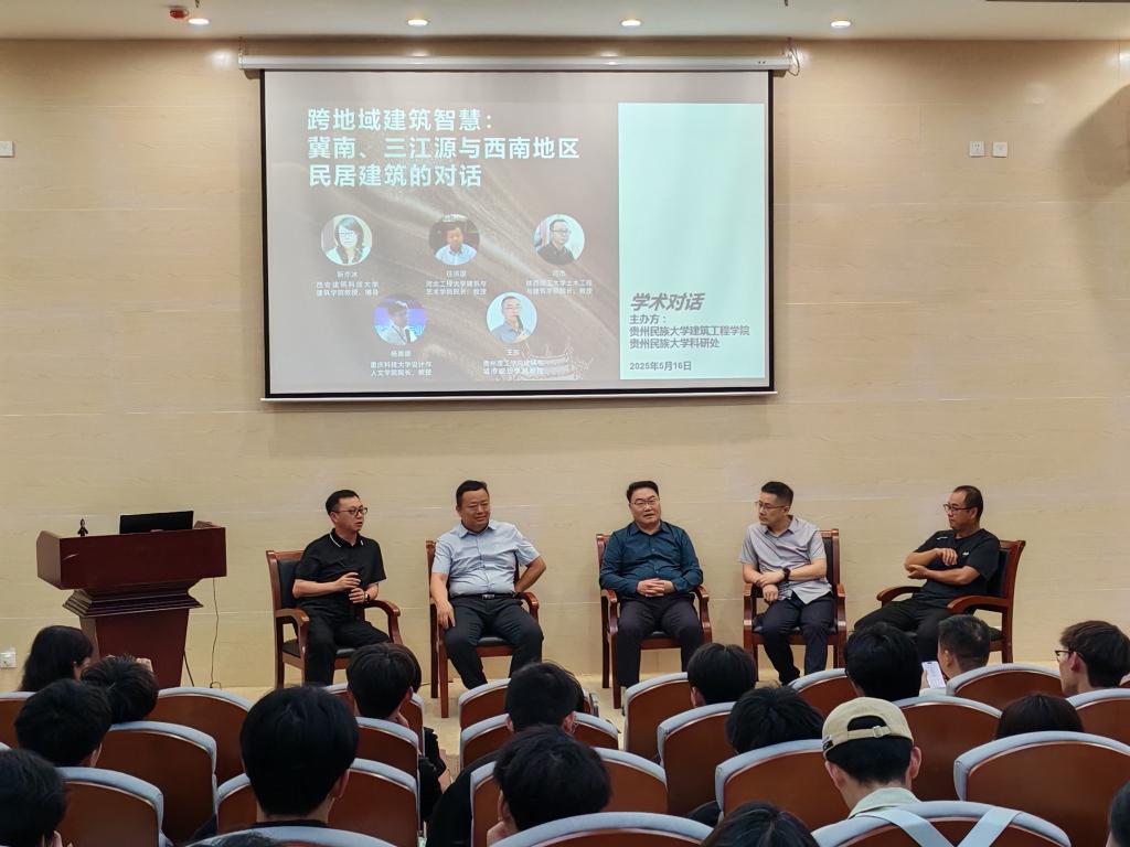 讲座尾声,华南理工大学二级教授唐孝祥、河北工程大学任洪国教授、陕西理工大学闫杰教授、重庆科技大学杨恩德教授、贵州理工公司王东教授与在场的同学们围绕跨地域建筑智慧——冀南、三江源与西南地区民居建筑进行学术对话,探讨建筑空间面对不同的地域、不同的民族、不同的文化有怎样对应的呈现形式等。